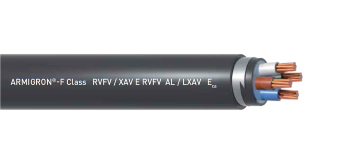 Cabo Armigron Class-F, tipo RVAV/XAV ou RVFV AL/LXAV, tensão nominal 0,6/1 kV, com condutor de cobre ou alumínio rígido, isolamento de XLPE, armadura de fitas de aço e bainha de PVC. Classe CPR Eca. Norma de desenho IEC 60502-1.